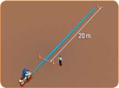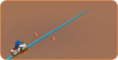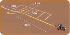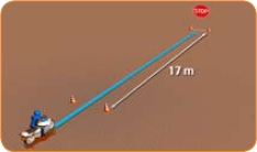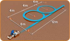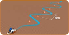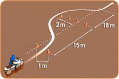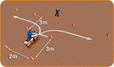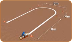 Met deze oefening laat je zien dat je een complete (denkbeeldige) acht kunt rijden in een rechthoekig kader. Je rijdt met trekkende motor en houdt daarbij een gelijkmatige snelheid aan. Je mag naast je voetrem eventueel ook een slippende koppeling gebruiken.
